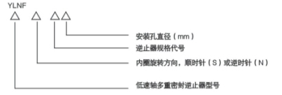 YLNFS10-200表示規(guī)格是YLNF10型,從軸端方向看,內(nèi)圈順時針方向旋轉(zhuǎn),安裝孔直徑d為200mm的低速軸多重密封逆止器。
